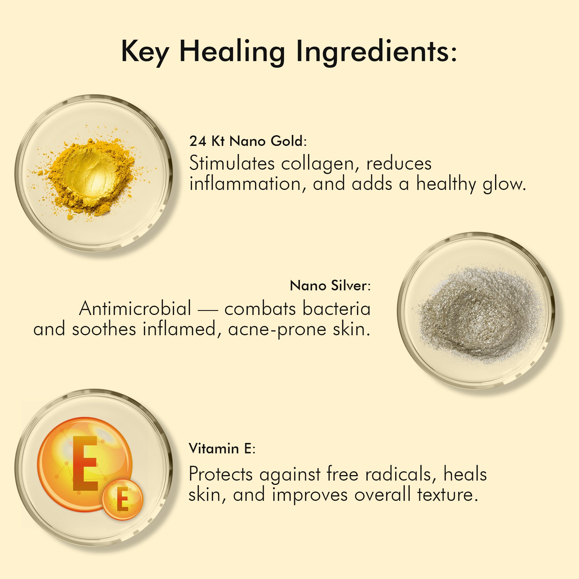Udvarthana Thailam, Tribal Multifloral Forest Honey, 24 Kt Nano Gold, Sodium Methyl Cocyl Taurate, Nano Silver, Vitamin E, Nano ZnO, Nano TiO2, Plasma Bamboo Activated Charcoal, Sodium Levulinate, Rhassoul Clay, Glycerol, Bentonite Clay, Willow Bark (natural Salycilic acid), Glycoin, Bifida Probiotic, Oats, Soy, Silk Protein, Sodium Cocyl Glutamate, Sodium Cocoyl Isethionate, Sodium Anisate