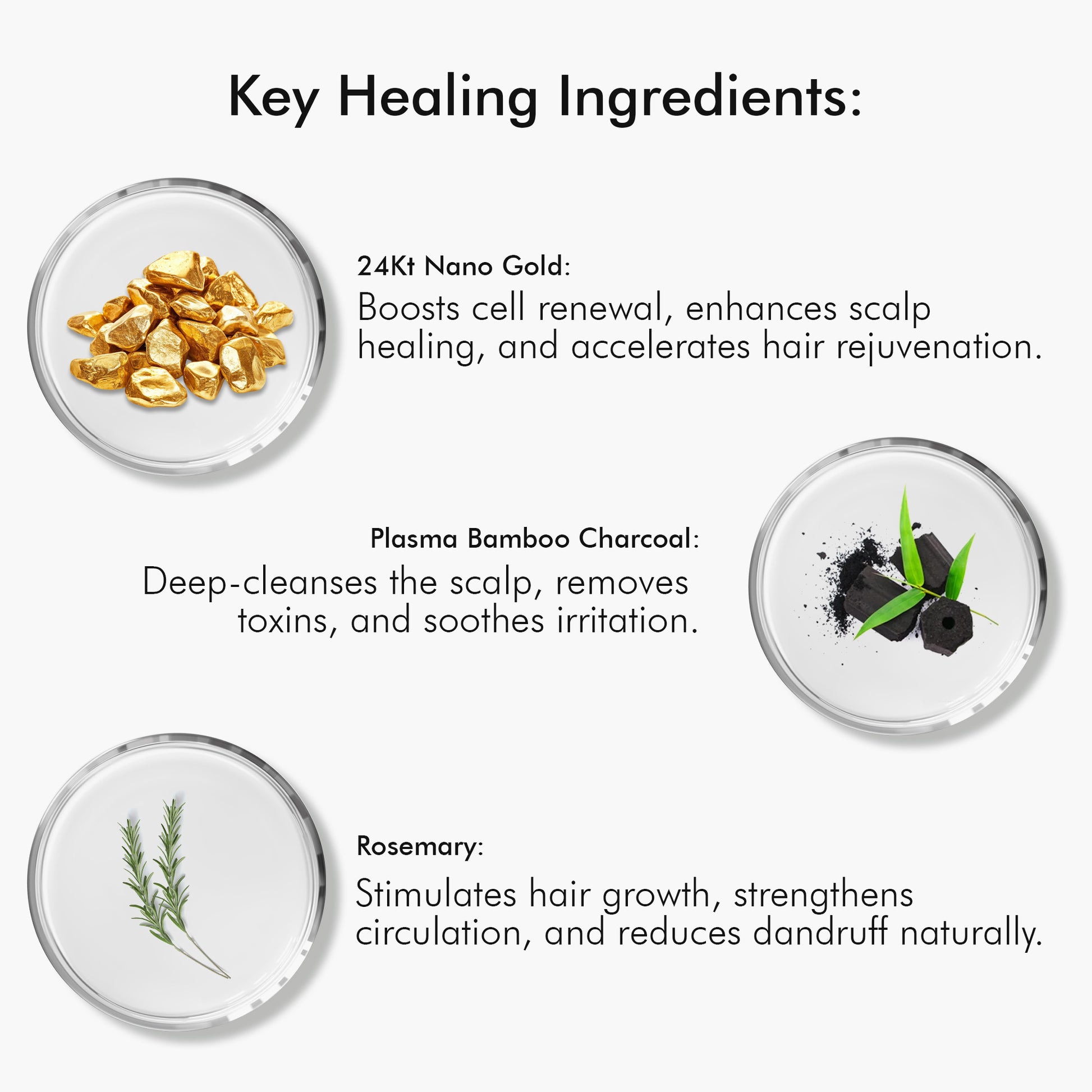 Plasma Bamboo Charcoal, 24K Nano Gold, Rosemary, Thyme, Bhringraj, Bhrahmi, Ashwagandha, Indrajau Leaves, Argan Oil, Jojoba Oil