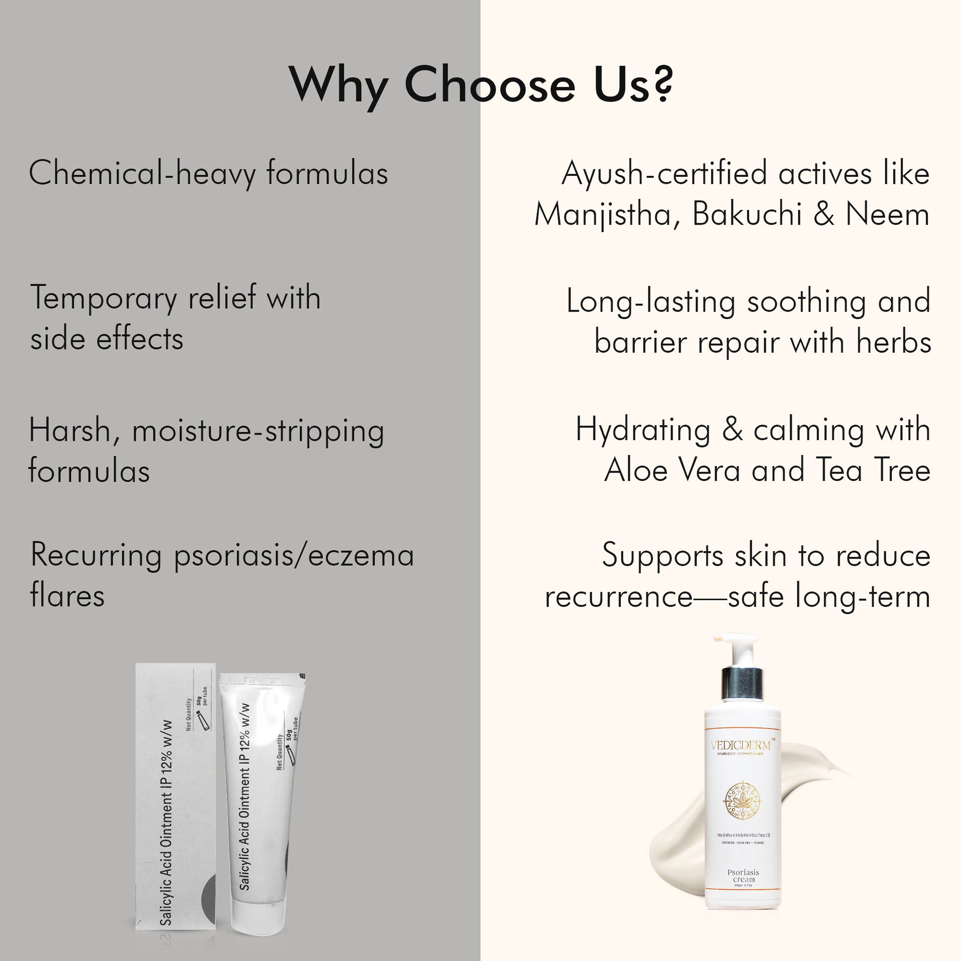 Yes. VedicDerm Psoriasis Cream is 100% steroid-free and designed for long-term, safe use — without the risk of skin thinning or dependency.