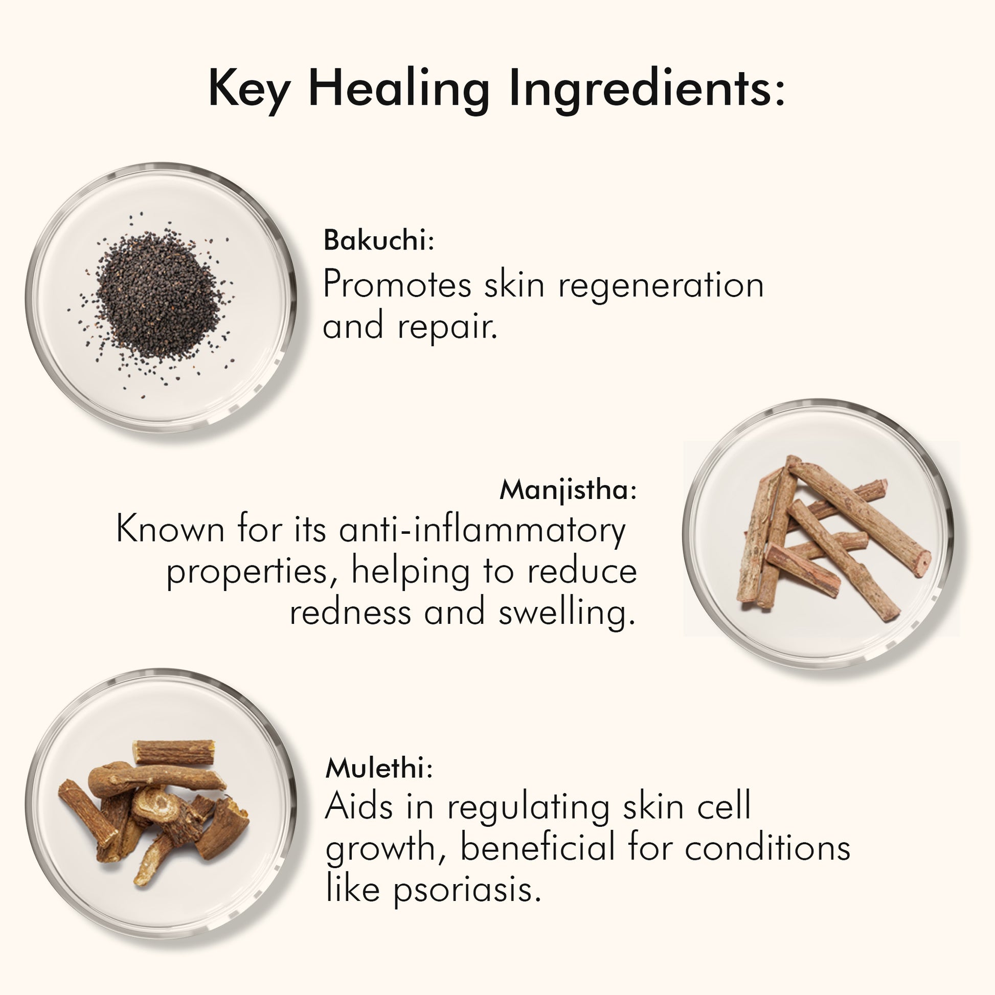 - ಅಸಾಧಾರಣ, ಎಲ್ಲಾ-ನೈಸರ್ಗಿಕ ಆರೈಕೆ : ಬಕುಚಿ, ಮಂಜಿಷ್ಠ, ಮೂಲೇತಿ, ಅಲೋವೆರಾ, ಬೇವಿನ ಎಣ್ಣೆ ಮತ್ತು ಟೀ ಟ್ರೀ ಎಣ್ಣೆಯ ಶಕ್ತಿಯನ್ನು ಬಳಸಿಕೊಳ್ಳುವುದು, ನಮ್ಮ ಸೂತ್ರವು ಶುಷ್ಕತೆ, ತುರಿಕೆ ಮತ್ತು ಕೆಂಪು ಬಣ್ಣವನ್ನು ಎದುರಿಸುತ್ತದೆ, ಚರ್ಮದ ವಿಶ್ರಾಂತಿ ಮತ್ತು ಪುನರ್ಯೌವನಗೊಳಿಸುವಿಕೆಯನ್ನು ಉತ್ತೇಜಿಸುತ್ತದೆ.
