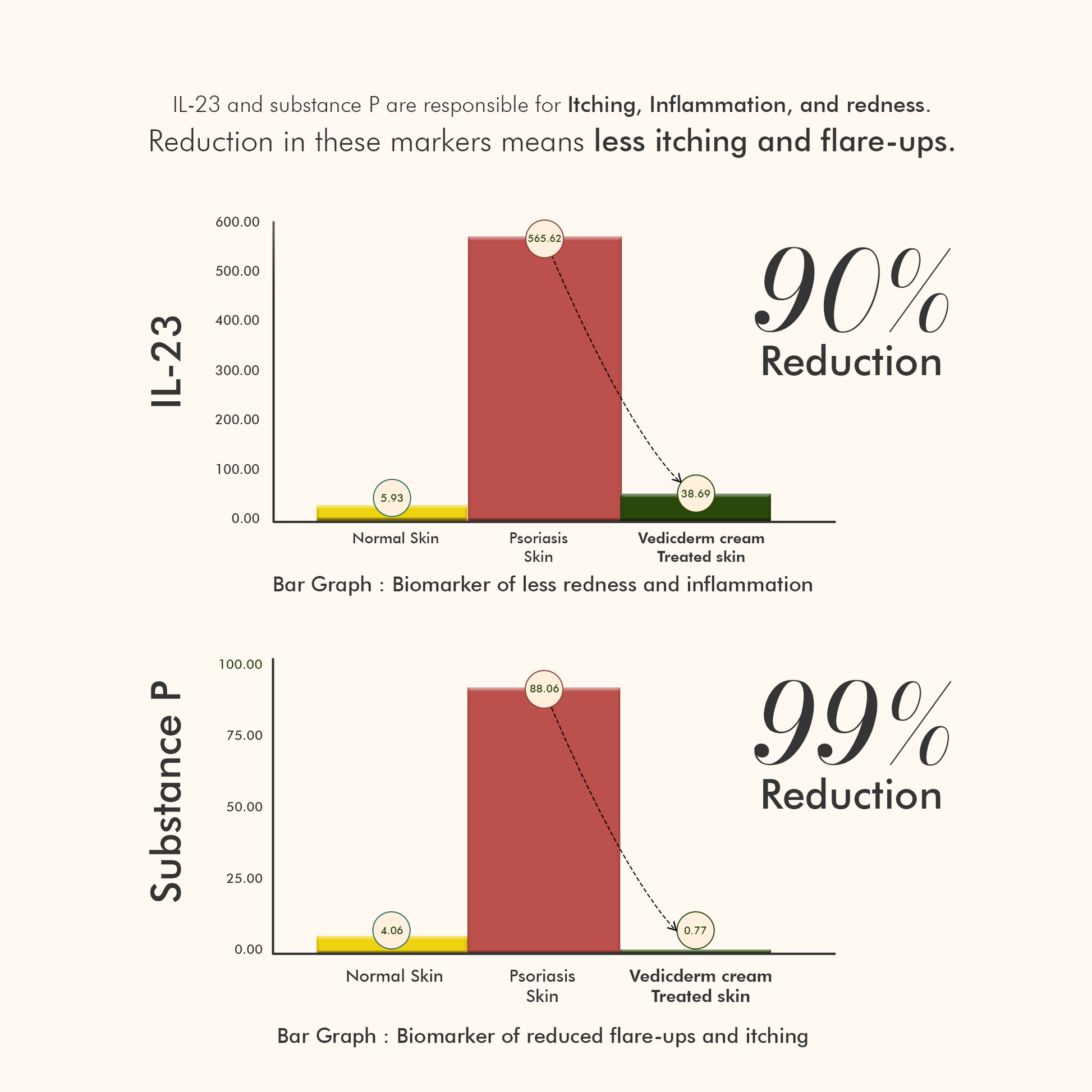 Most creams offer surface-level relief. VedicDerm targets core inflammatory pathways, clinically reducing Substance P, histamine, IL-23, and IL-17 — key markers in chronic psoriasis.