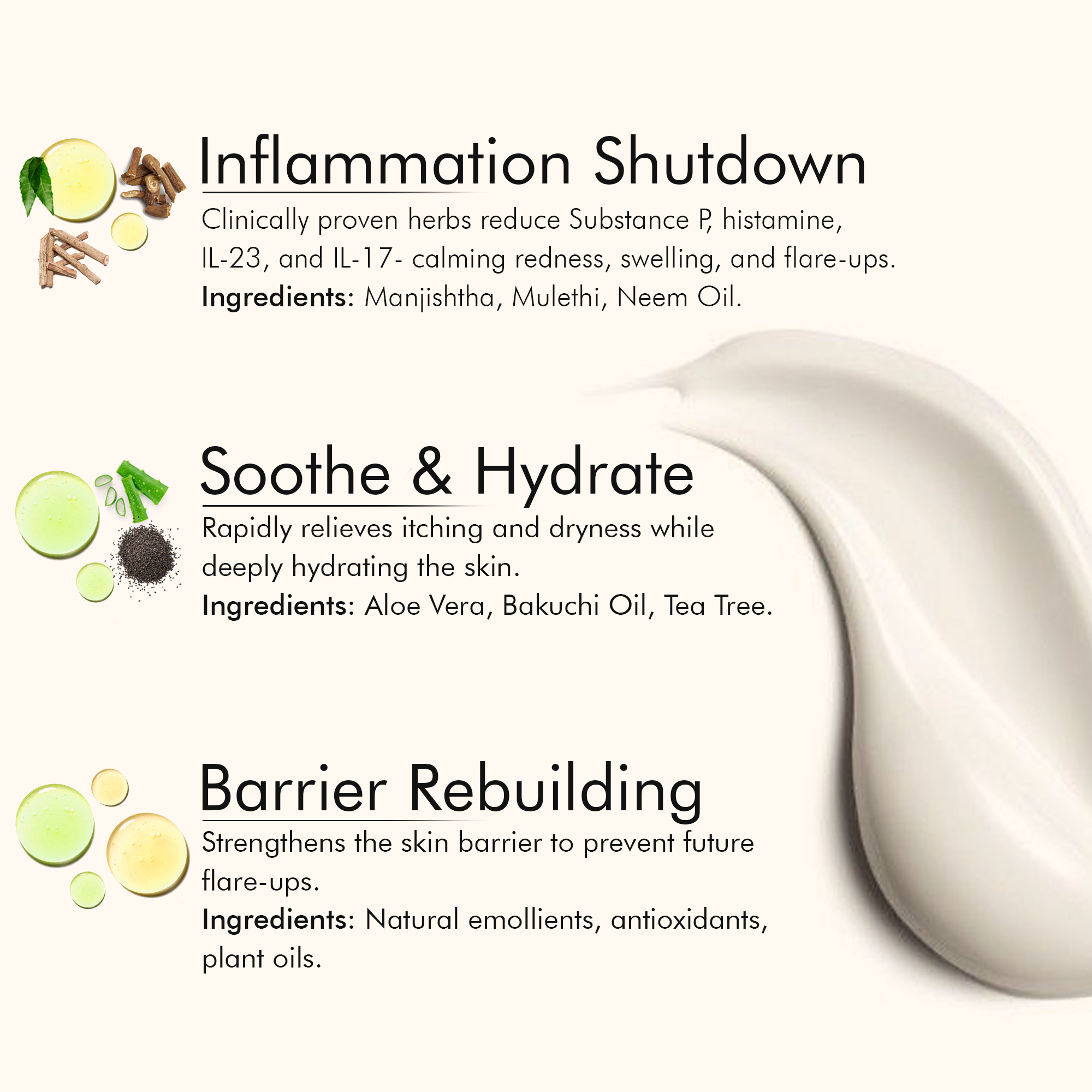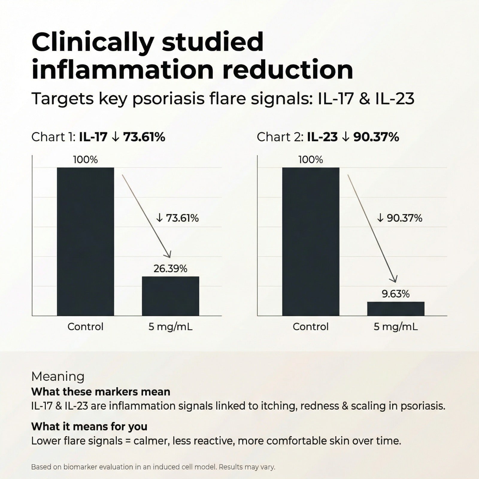 IL-17 and IL-23 are responsible for itching, redness, and plaque formation in psoriasis — by lowering them, our formulation helps restore calmer, healthier skin.