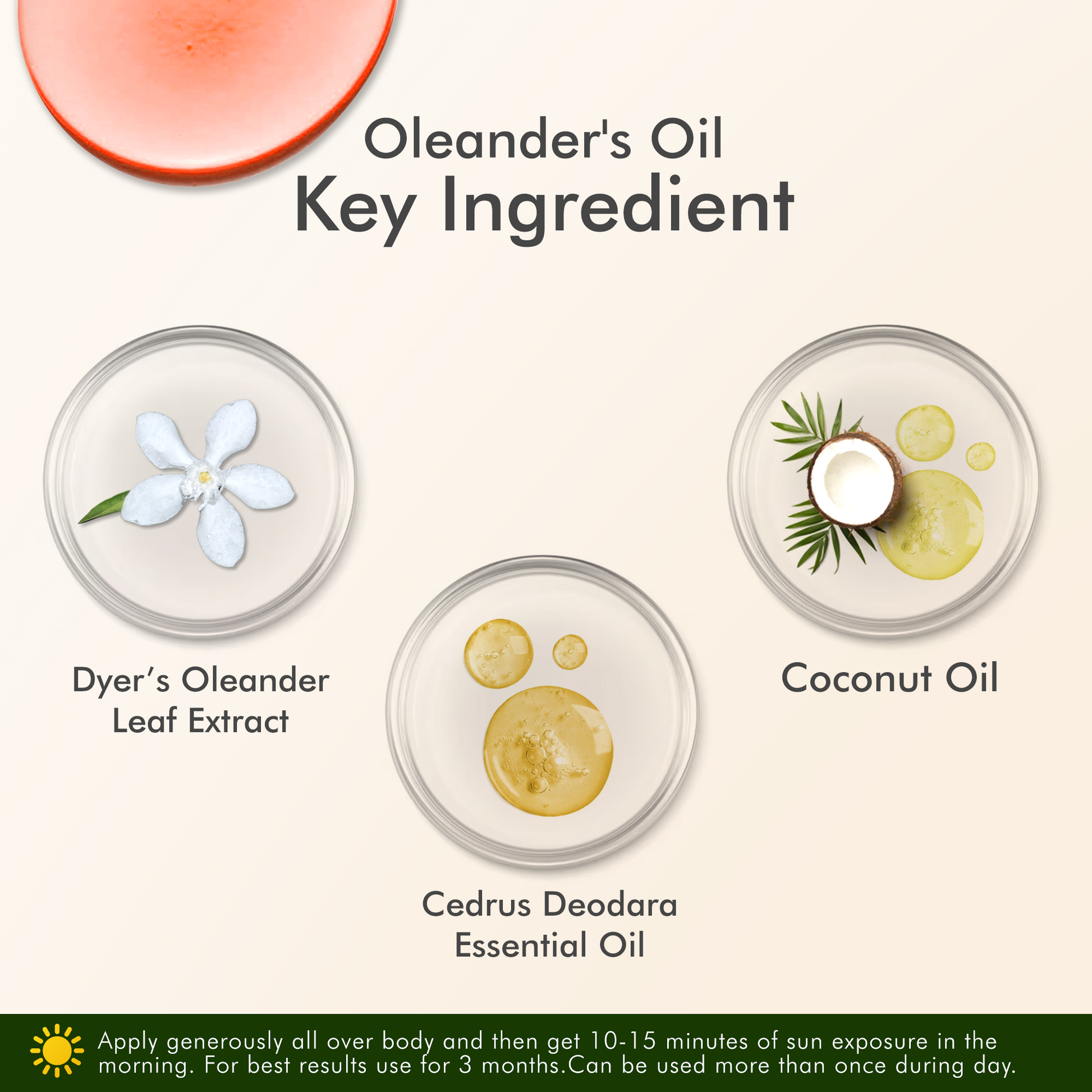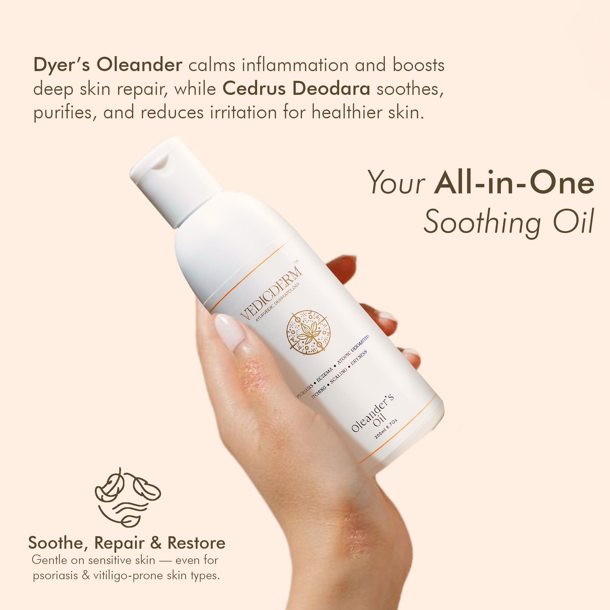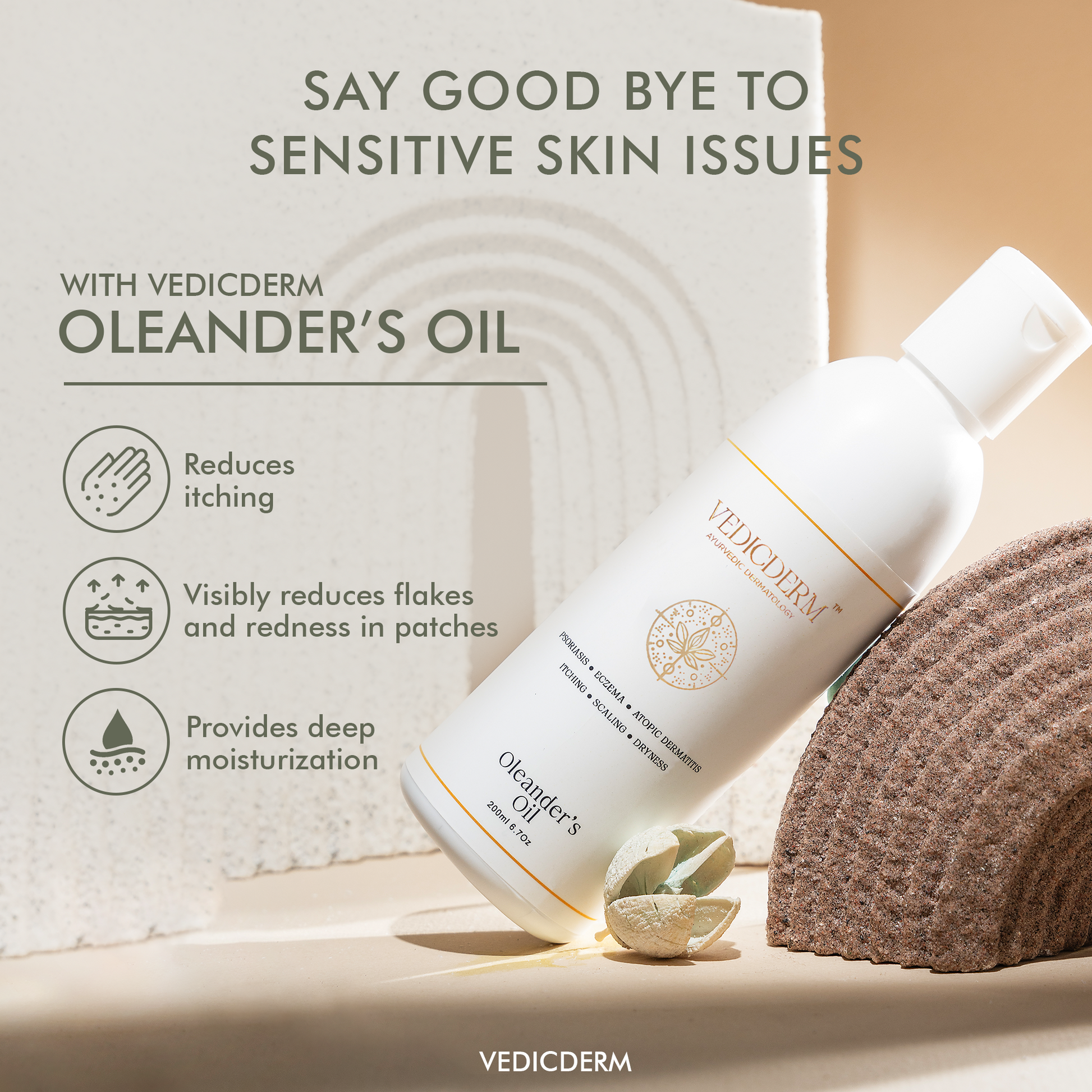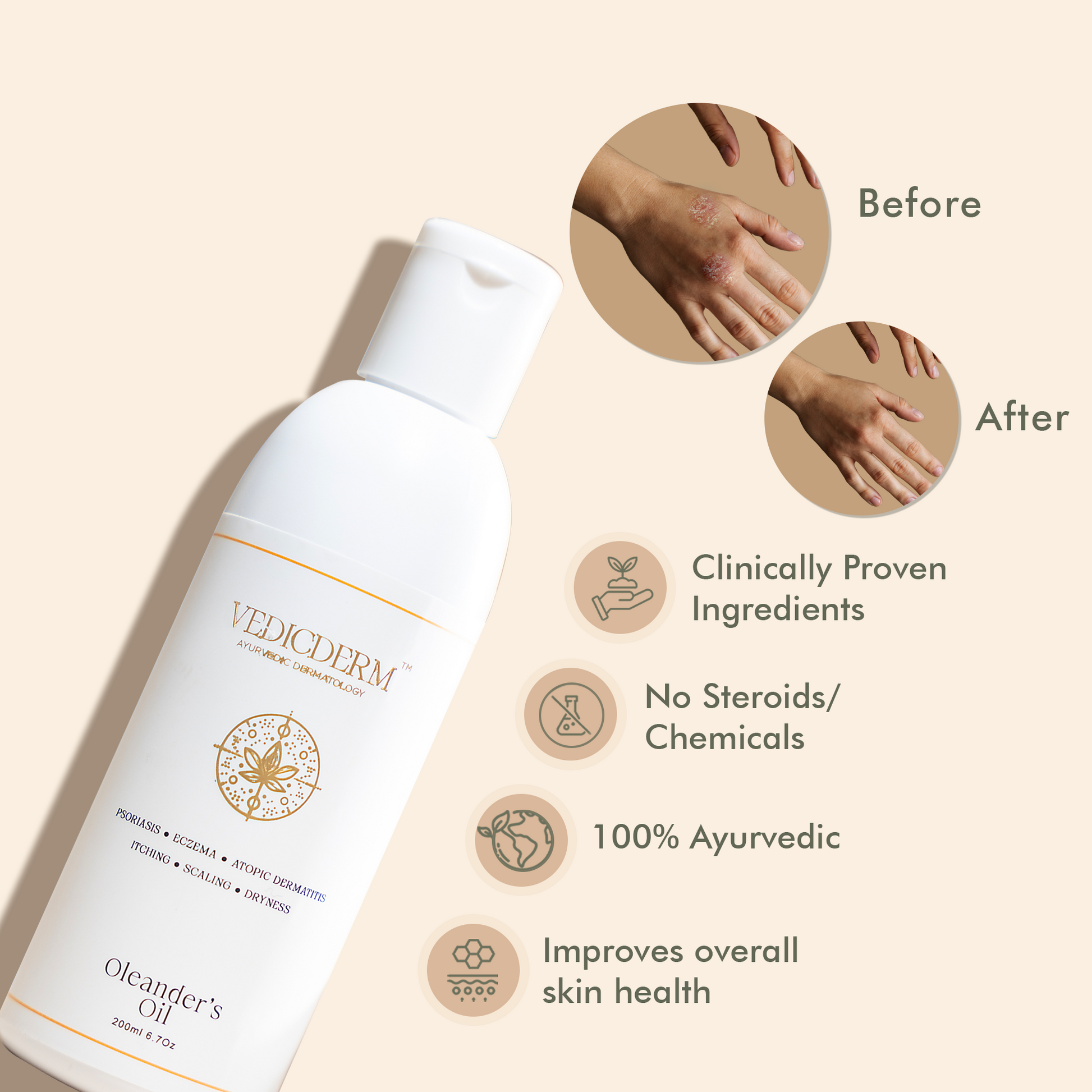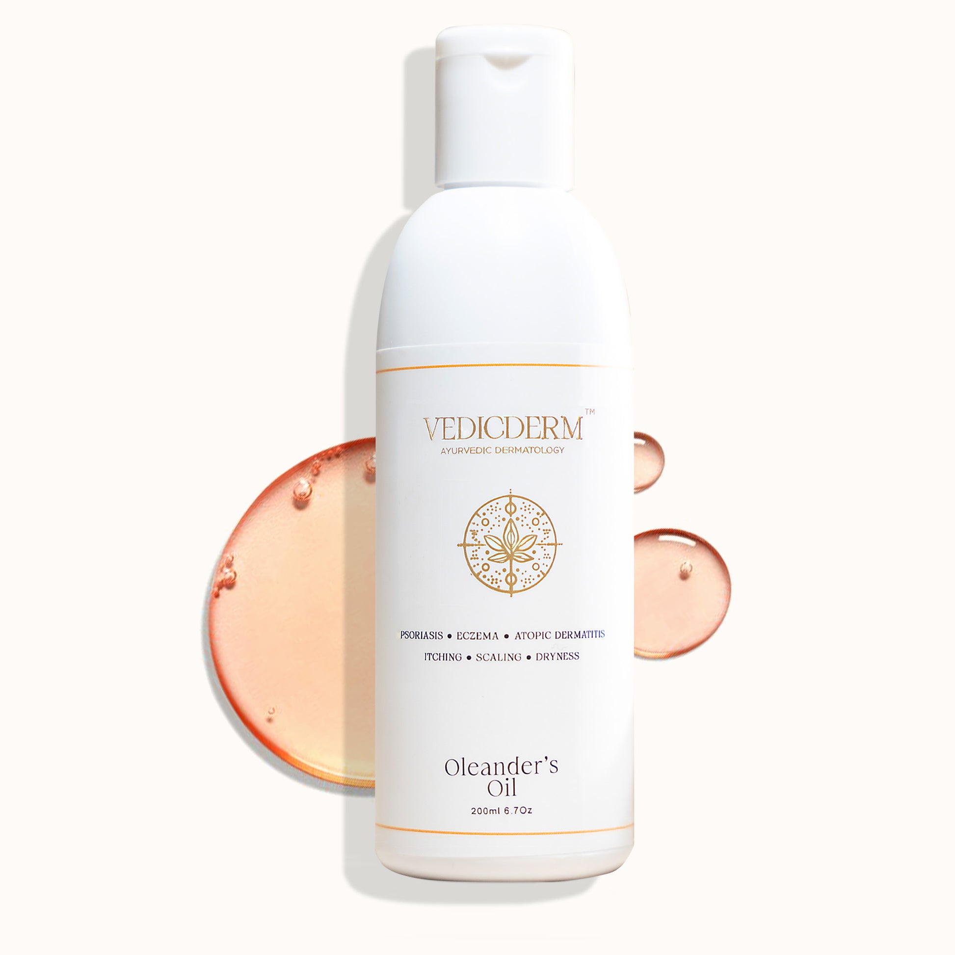 Say goodbye to the discomfort of psoriasis and sensitive skin with VedicDerm Oleander's Oil. Specially crafted for skin and scalp care, this powerful oil is enriched with natural ingredients to target redness, inflammation, itching, and dryness.