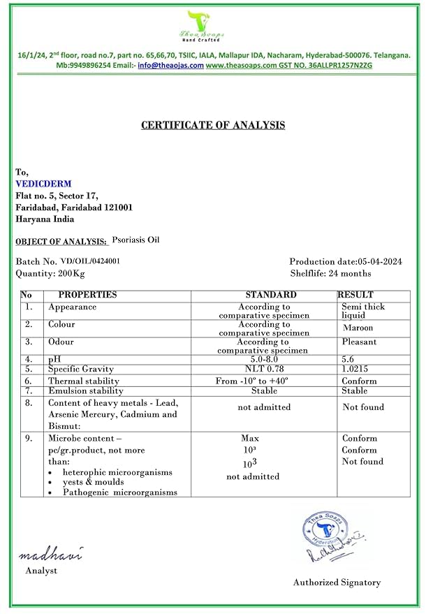Our Psoriasis Oil is doctor-formulated in India, combining Ayurvedic herbs with modern dermatological insight. Each batch is dermatologically tested and produced in GMP-certified facilities.