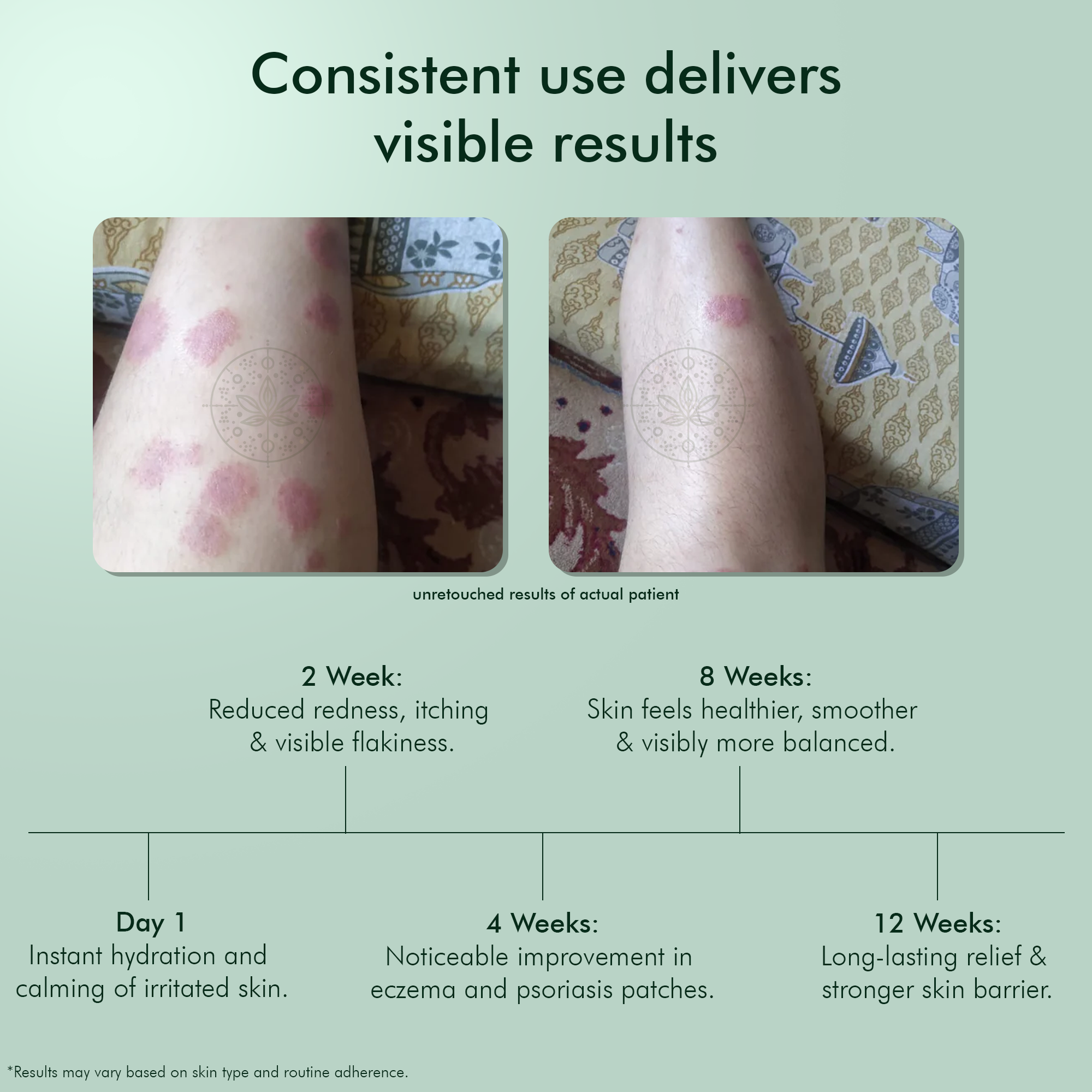 Many users notice reduced itching and redness within 7β10 days. For deeper healing and reduction in plaques, we recommend consistent use for at least 4β6 weeks.