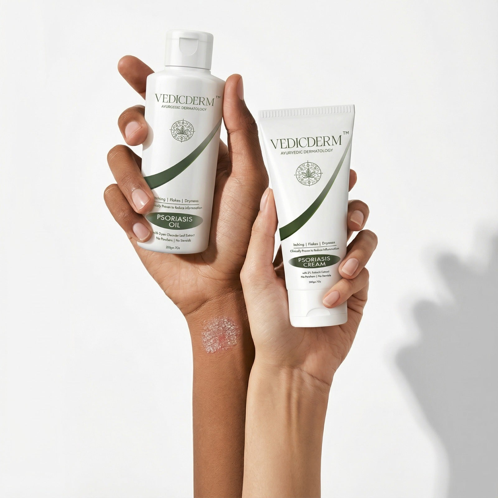 Our Sensitive Skin Bundle works in a two-phase cycle. The Psoriasis Oil reduces inflammation, softens flakes, and is activated by morning sunlight for enhanced results. The Psoriasis Cream then rebuilds the skin barrier at night, deeply moisturizing and repairing the skin. Together, they create a 24-hour healing system that targets psoriasis at the root while restoring smooth, healthy skin.